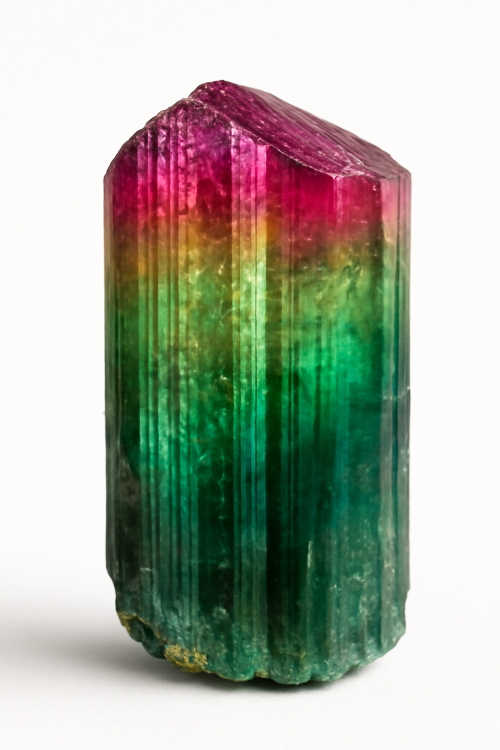 Multicolor borosilicate. Tourmaline is a crystalline silicate mineral group renowned for its extensive range of colors, with its chemical structure incorporating boron and various metals such as aluminum, iron, magnesium, sodium, lithium, or potassium. Tourmaline crystals commonly form in granite, pegmatite, and metamorphic rocks and can occur in virtually any color, including black, green, pink, red, blue, brown, and multicolored varieties. Tourmaline is prized for its protective, grounding, and balancing energies, and is believed to promote emotional healing, detoxification, and protection against negative energies. Different colors are associated with various chakras and effects.